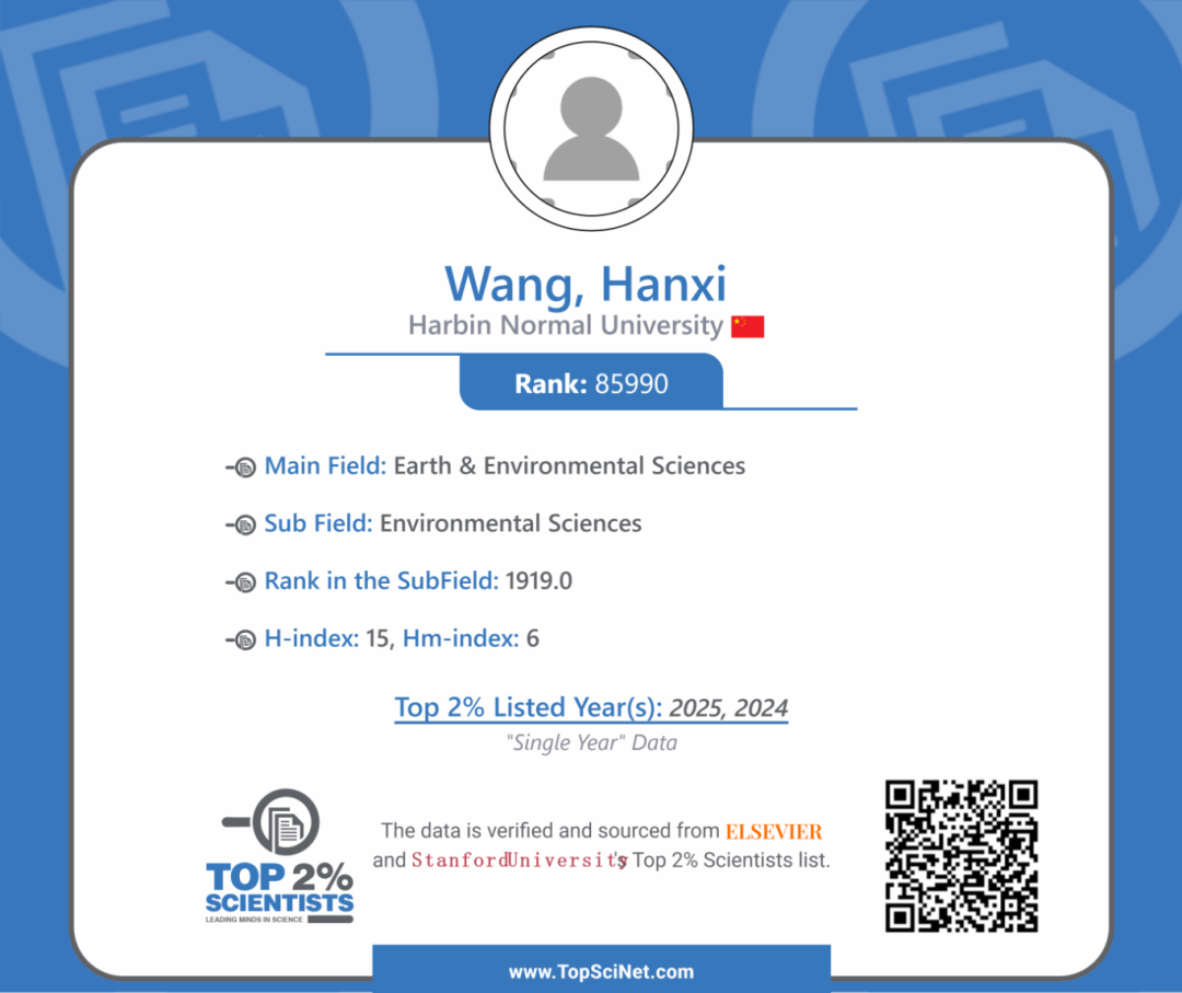近日,斯坦福大学(Stanford University)和国际权威学术出版社爱思唯尔(Elsevier)共同发布2025年全球前2%顶尖科学家榜单(World's Top 2% Scientists)。哈尔滨师范大学地理科学学院王汉席教授入选“全球前2%顶尖科学家年度影响力”榜单。全球前2%顶尖科学家榜单从全球近700万名科学家中,基于其论文引用数、h因子、hm因子、第一或通讯作者论文引用的文章引用数等综合参数,遴选出世界排名前2%的科学家,涵盖22个领域和174个子领域,该榜单是衡量全球学者学术影响力的重要指标。