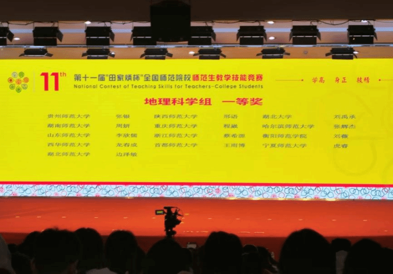 张辉杰决赛抽取的课题为中图版高中地理必修一第一章第三节《地球的演化过程》,在无网络的情况下规定备课时间内完成了教学设计与课件制作,融入中华优秀传统文化中神话故事《盘古开天辟地》作为授课导入,吸引学生兴趣的同时增强文化自信;新课讲授环节创设情境,通过不同年代生物的对话探究各个年代的特征,学习课本知识,提高学生综合思维与地理实践力;最后课堂小结布置作业进一步巩固新知。最终张辉杰同学凭借精湛的技能和出色的表现荣获“田家炳杯”第十一届全国师范院校师范生教学技能竞赛地理科学组一等奖。