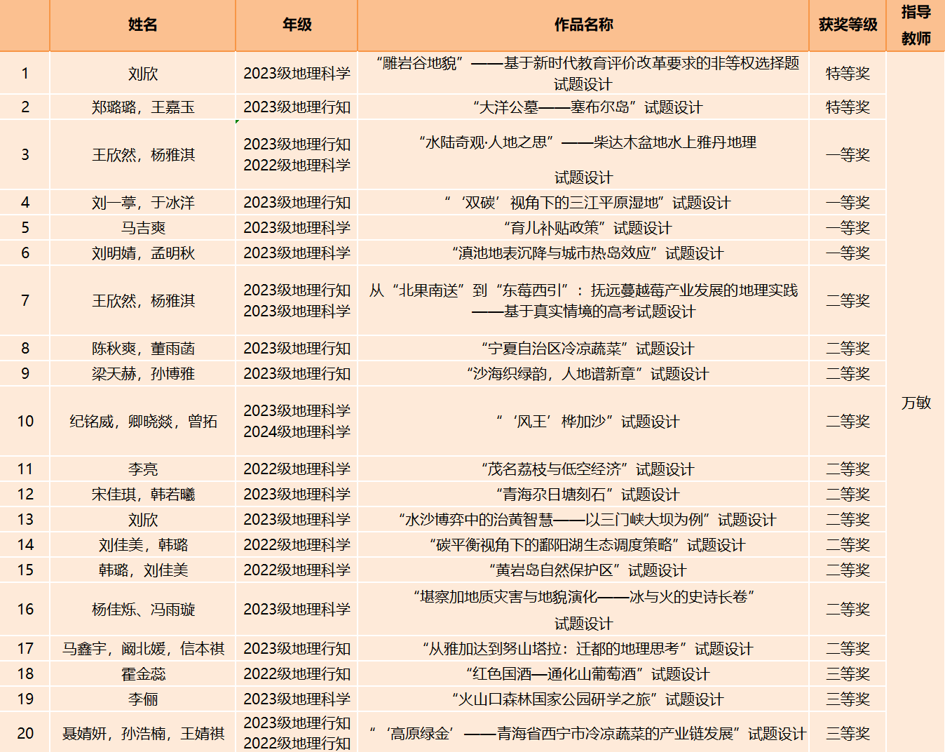 本届命题大赛共收到来自全国各地初高中地理教师、教研员、高校师生提交的2000余份作品。经过多轮专家匿名评审,我院学生提交的20份地理原创试题设计作品凭借其突出的学科价值、鲜明的时效创意、严谨的逻辑结构以及规范的语言表达,在众多参赛作品中脱颖而出,充分展现了我院学子扎实的专业功底与卓越的教学创新能力。