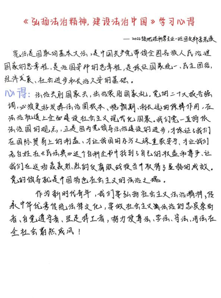 为深入学习贯彻党的二十大精神,贯彻落实中央、省委和学校党委关于开展主题教育的部署要求,学习领会习近平新时代中国特色社会主义思想,全面落实《学校共青团2023年“基层组织建设年”工作方案》,切实加强理论武装,做好党的创新理论“青年化”阐释,地理科学学院团委特组织开展“赓续红色血脉·砥砺奋进力量”主题团支部政治理论学习活动,于4月20日19:00在理工三220室开展第二期《弘扬法治精神,建设法治中国》理论学习活动,2021级、2022级团支部委员会全体成员参加学习。