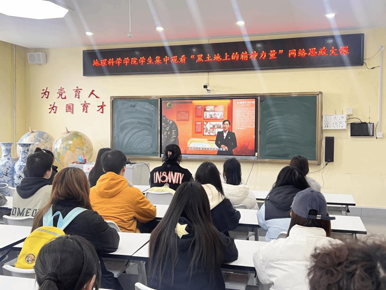 为深入学习贯彻习近平新时代中国特色社会主义思想和党的二十大精神,贯彻落实全国、全省教育大会精神,持续推进大中小学思政课一体化建设、课堂教学和思政实践深度融合,引导学生铭记党的光辉历史,缅怀革命先辈的丰功伟绩,地理科学学院团委组织学生集中收看由中共黑龙江省委教育工作委员会、黑龙江省教育厅主办,黑龙江省高校网络思想政治工作中心(黑龙江大学)承办的龙江高校思政大讲堂“黑土地上的精神力量”网络思政大课第一讲、第二讲。