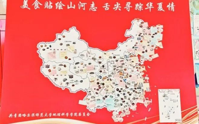 美食为笔,绘就山河万象;文化作墨,书写华夏千秋。为扎实推进学校共青团2025年“基层组织创新年”工作方案,积极响应增强文化自信的时代号召,地理科学学院团委充分发挥地理学科在地域文化方面的独特优势,举办“美食贴绘山河志,舌尖寻踪华夏情”主题贴纸绘地图活动。此次活动独出心裁,将美食贴纸与中国地图精妙融合,以美食为独特文化纽带,旨在引领青年学生深度探寻祖国各地的风土人情与历史文化,体悟中华美食的深厚内涵,在趣味盎然的互动中感受文化魅力,提升文化素养,进而增强文化自信与民族凝聚力。
