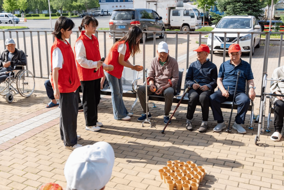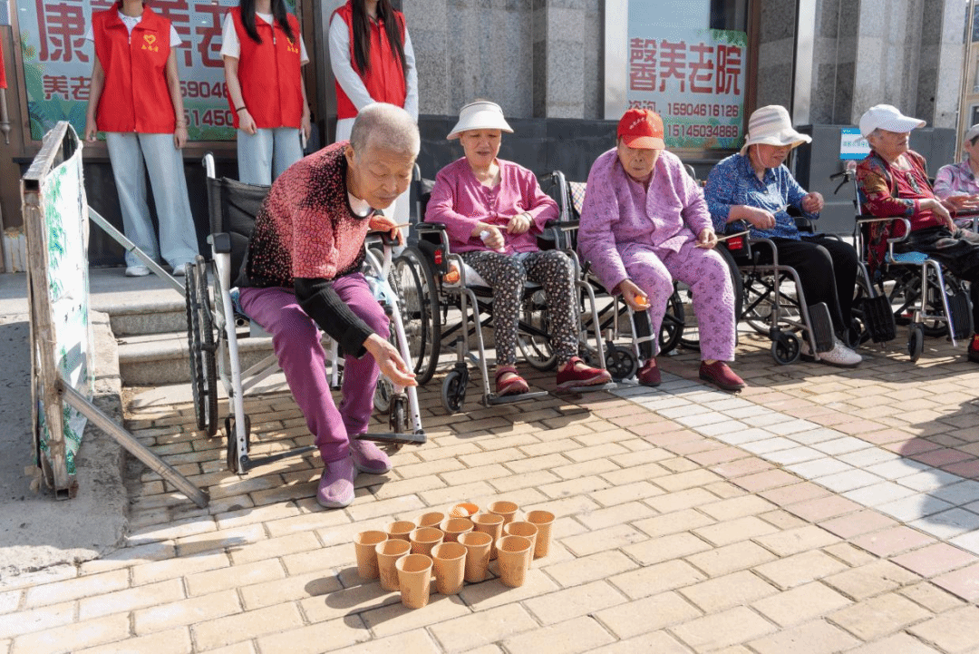 游戏环节是这次活动的一大亮点。在“棍子传杯”接力赛中,老人们分组协作、争分夺秒,每一次成功传递都引发阵阵喝彩;“乒乓球进杯”挑战区里,老人们化身“神投手”专注投掷,进球时的喜悦溢于言表。这些趣味游戏轻松跨越年龄鸿沟,欢声笑语充盈养老院,点亮了温馨美好的午后时光。