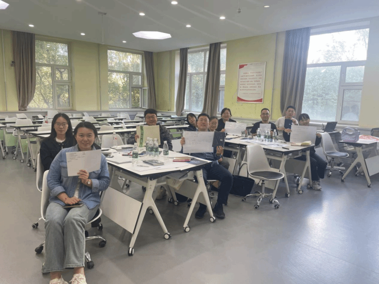 第二部分“AI个性化应用展示与AI教学设计”更加注重教学场景的实践融合。智慧树培训师介绍了多种AI工具在教学过程中的应用案例,随后各小组以某一课堂教学为例,用大白纸和马克笔手绘教学设计图,明确标注AI应用环节及对应工具,展示如何借助人工智能实现课堂互动个性化、学情分析精准化、教学评估智能化。多位教师代表畅谈AI赋能的教学新思路,现场交流热烈。