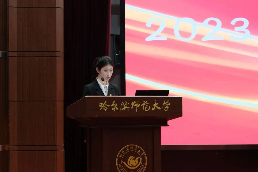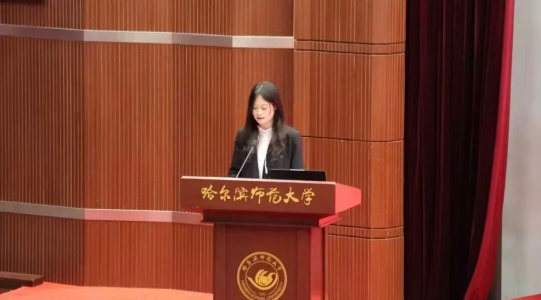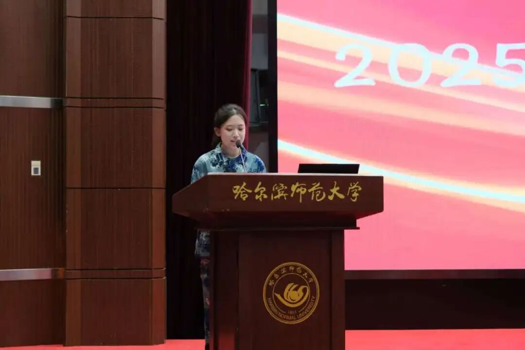 典礼第二项,本科生新生代表、2025级地理科学专业常瑜发言。她代表全体本科新生向学院领导与老师们致以诚挚感谢,并表示来自各地的新生汇聚于哈师大地理科学学院,是求学路上的重要里程碑,也是一个全新的起点。她谈到,大家期待在这里涵养师德、夯实专业基础,依托学院的科研优势,在老师引领下积极参与前沿项目,促进理论与实践相结合,用奋斗书写大学时光,努力成长为合格的新时代地理人。