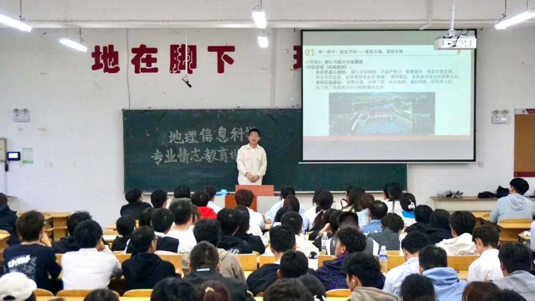 在专业基本情况介绍完毕后,马野老师为学生系统梳理了专业发展路径。他指出,GIS毕业生不仅可投身自然资源、测绘等传统行业,更在互联网位置服务、数字经济、自动驾驶等新兴领域担任开发工程师、算法工程师等关键技术角色。升学方面,马老师介绍了国内考研与出国留学两条路径,并提醒同学们需注重学业成绩、科研竞赛与文书准备。他建议同学们大学期间应夯实编程、GIS软件、空间数据库等硬技能,同时培养空间思维与解决问题等软实力,鼓励大家通过项目、竞赛与实习积累实践经验,为未来奠定坚实基础。