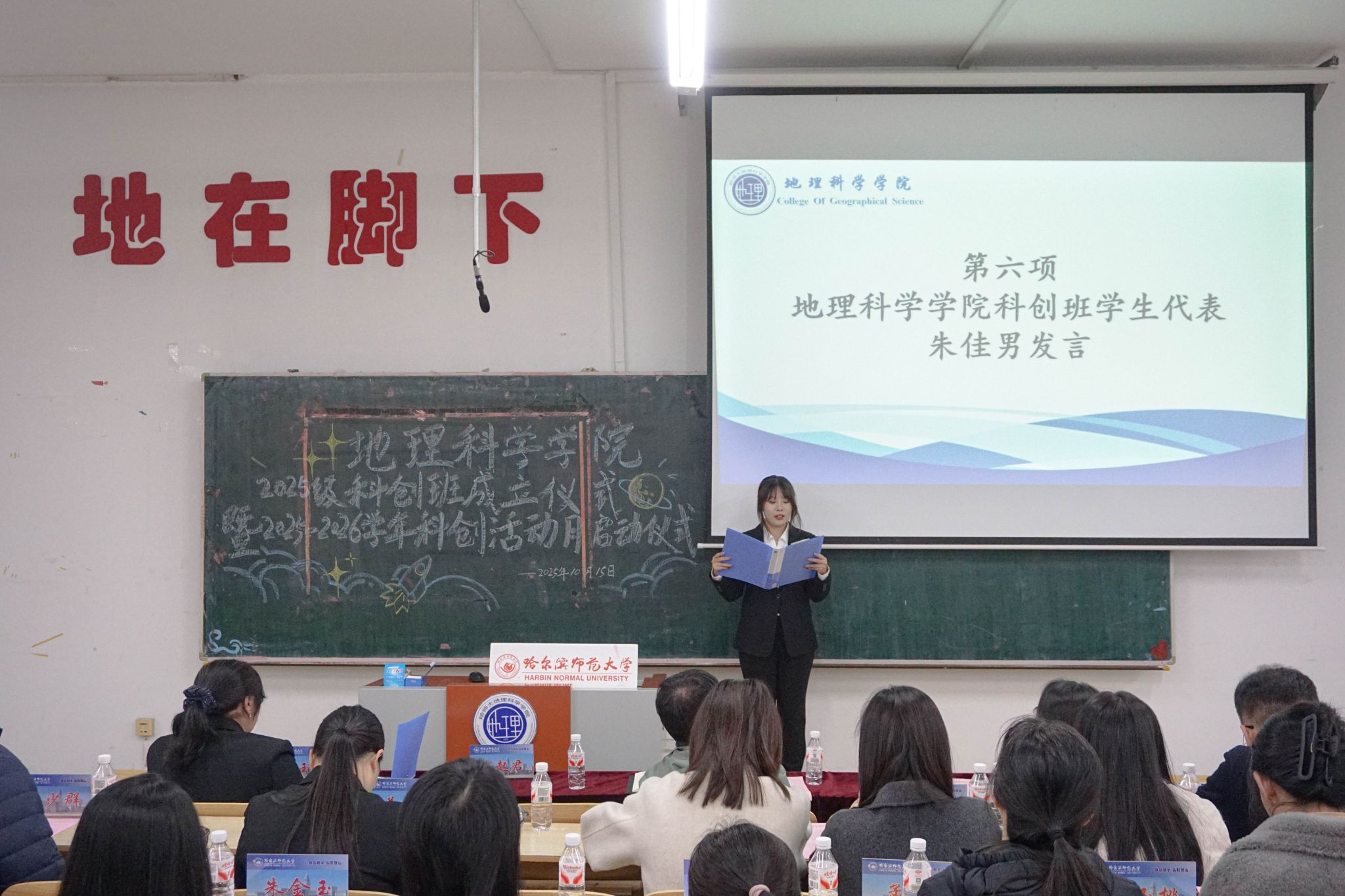 仪式第五项,科创导师代表、地理信息科学系负责人齐少群致辞,结合自身科研与育人经验,为2025级新生送上三点忠告:一是永葆科研热情,以持久热忱面对科研中的未知与挑战;二是广结科创伙伴,在思想碰撞中拓宽思路,在团队协作中攻克难题;三是坚守科创初心,不急于求成、不畏惧失败,在沉淀中成长为更具竞争力的创新人才。