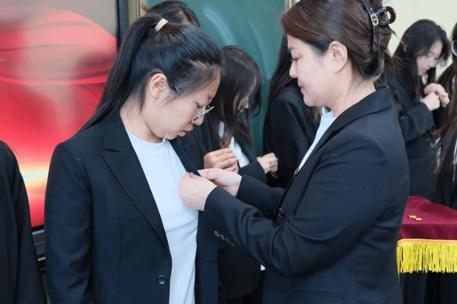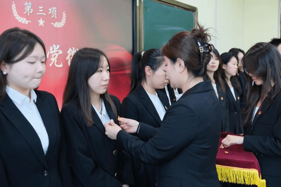党委委员宋歌为预备党员佩戴党徽,表达对他们加入党组织的热烈祝贺。