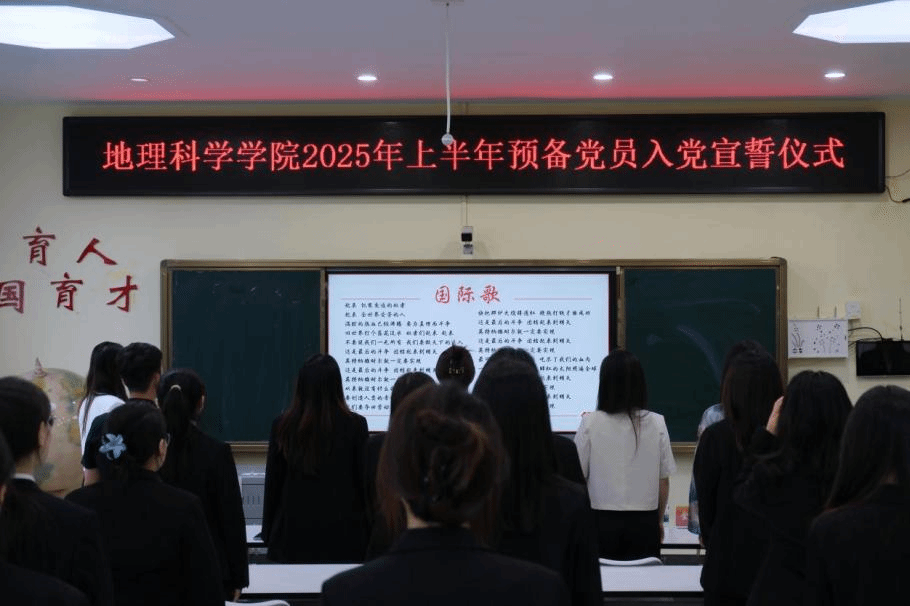 随着激昂的《国际歌》旋律响起,地理科学学院预备党员入党宣誓仪式进入尾声。全体与会人员庄严肃立,在铿锵有力的歌声中,重温党的初心与使命,感受共产主义信仰的力量。
